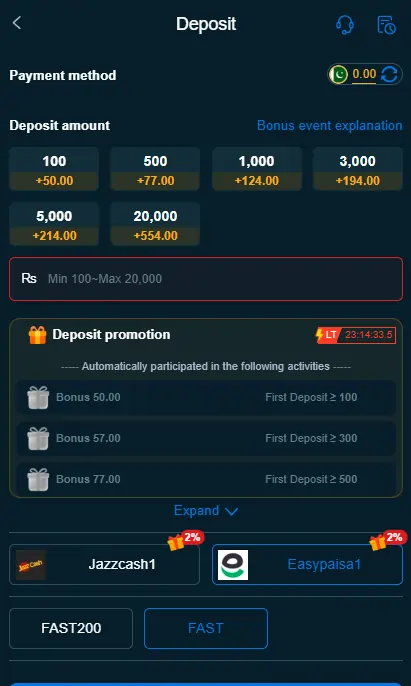 You can deposit using JazzCash, EasyPaisa or bank transfer with one-click deposit. Now you can easily put the bets and get ready to compete.